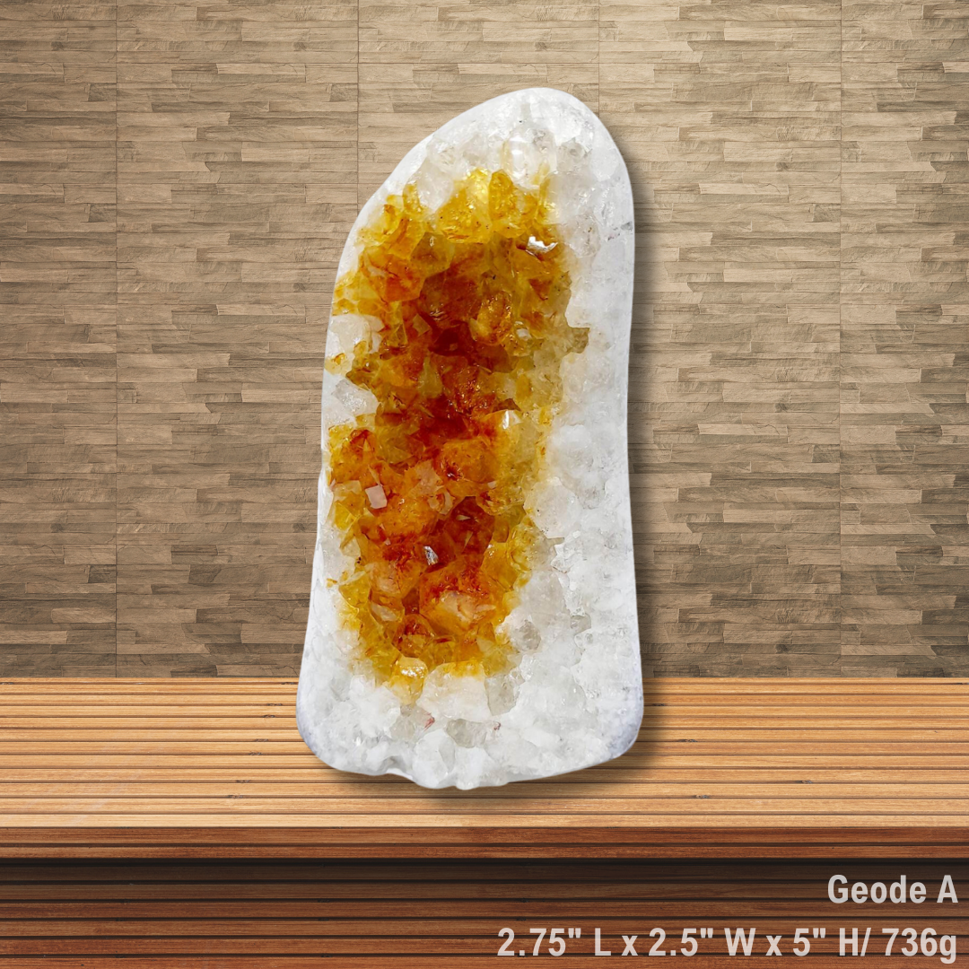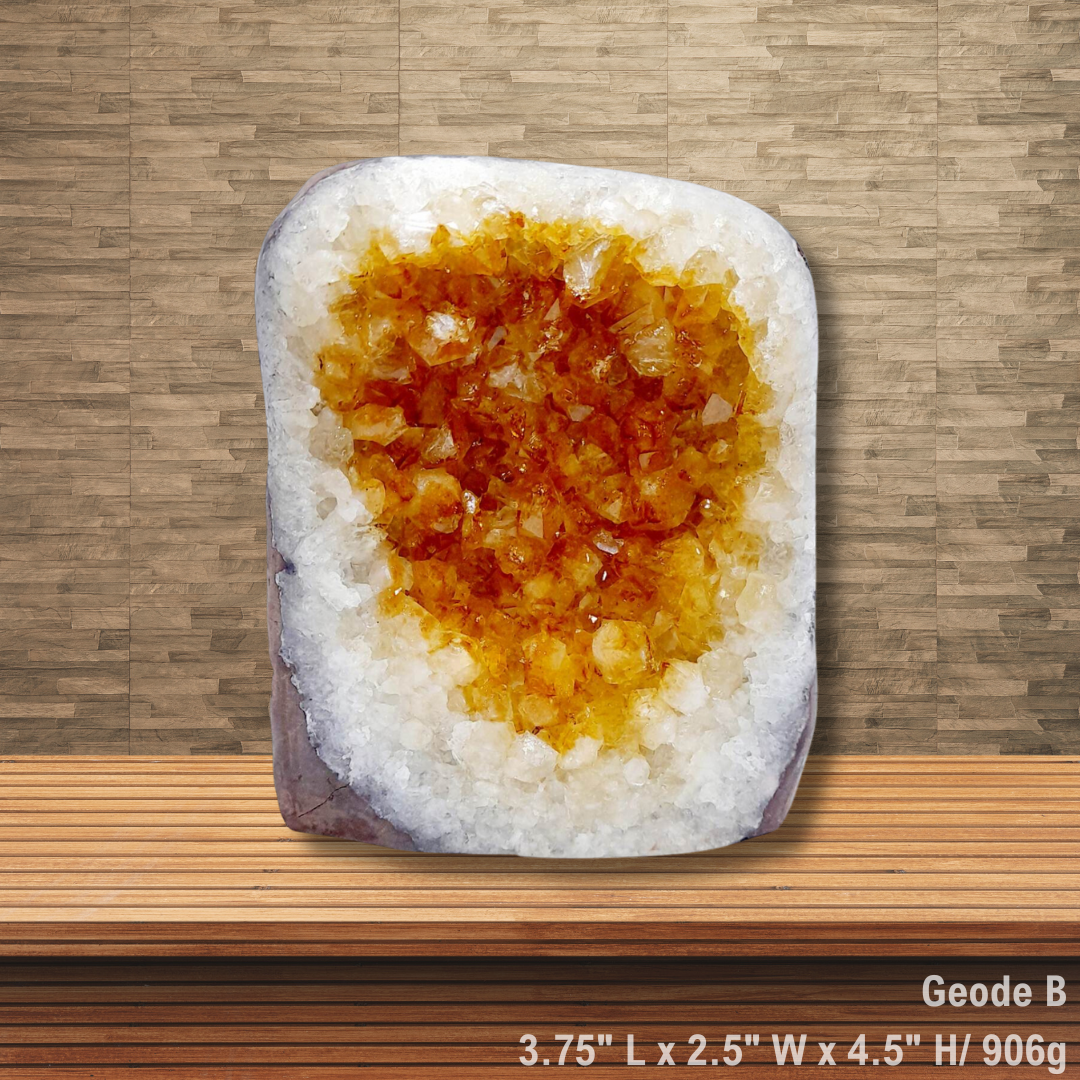 These clusters are filled with golden Citrine associated with positivity and optimism, It's often used to assist in manifesting financial abundance and opportunities. It can also be used to awaken the solar plexus chakra, helping to cultivate confidence, happiness, self-confidence, happiness, inner strength. and personal power. Additionally, Citrine geodes help us to tap into our Solar Plexus, aids in digestion, increases physical energy, enhances motivation and inspiration, and offers prosperity and abundance.