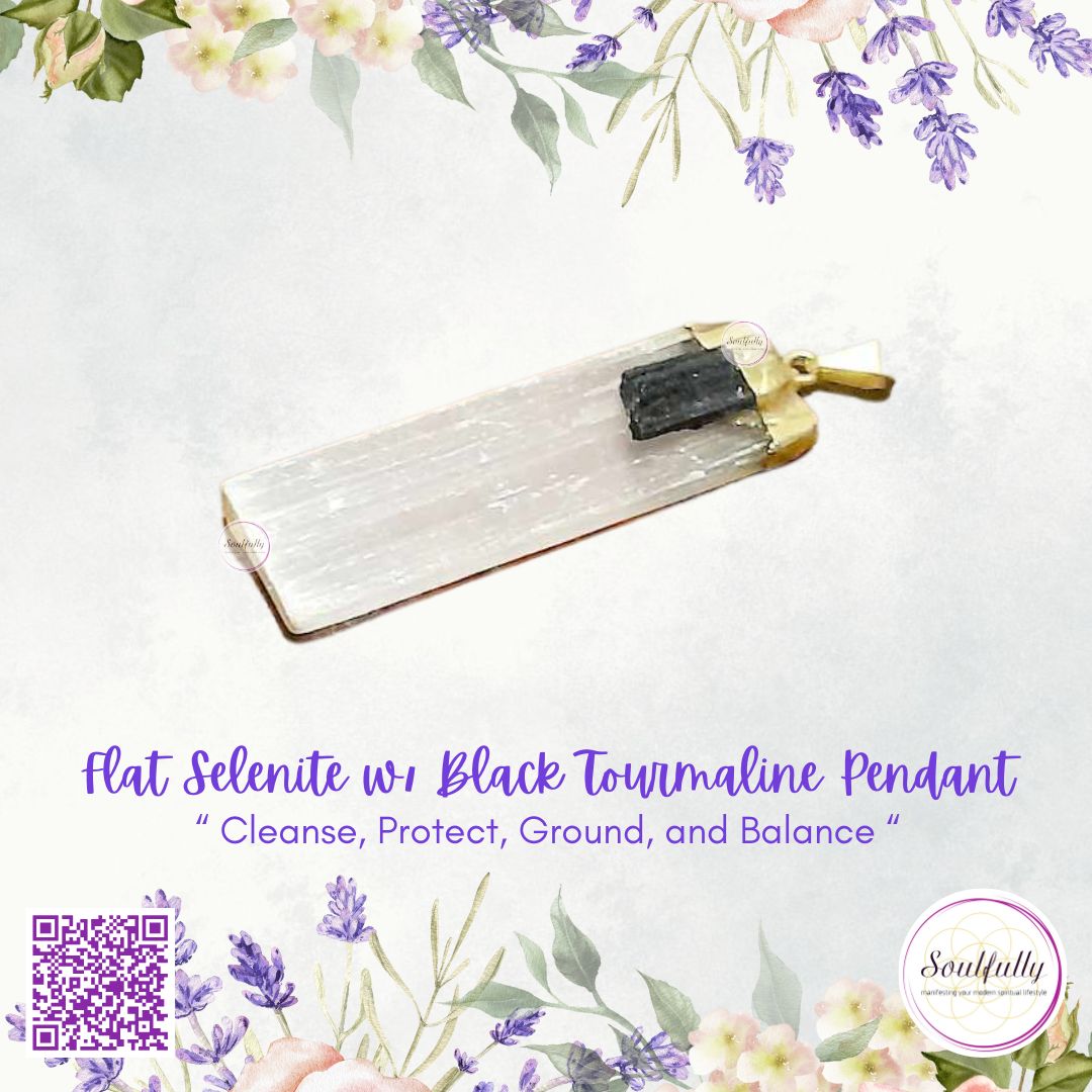 A Flat Selenite with Black Tourmaline Pendant combines two powerful protective and cleansing crystals — making it an ideal talisman for energetic balance, spiritual clarity, and grounding.