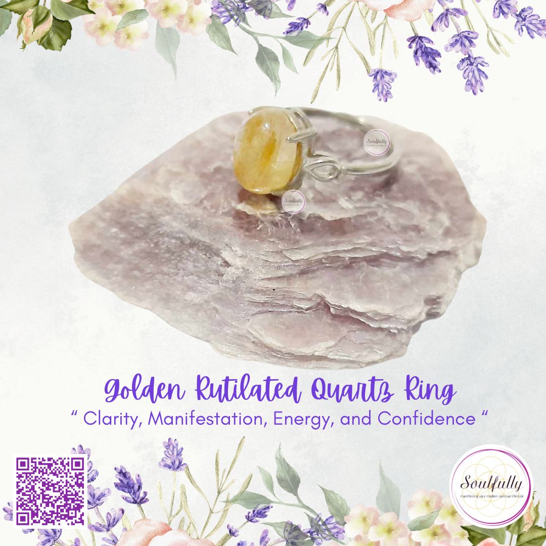 A Golden Rutilated Quartz ring features clear quartz filled with shimmering golden needle-like inclusions of rutile. These golden threads give the stone a radiant look and powerful energy—often referred to as the “Illuminator Stone.”