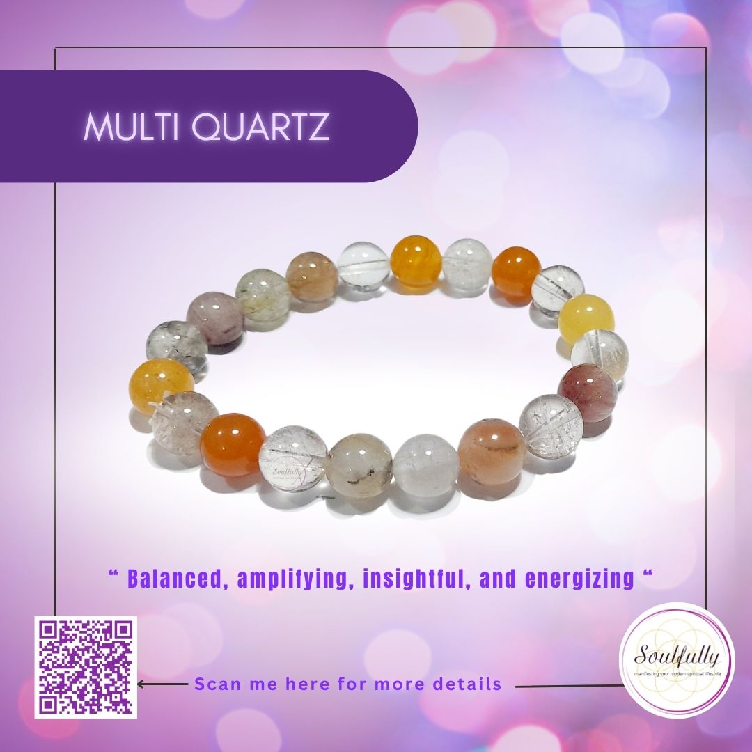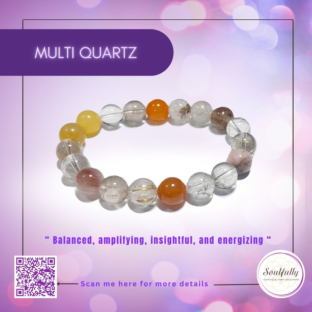 Multi Quartz is not a specific mineral but a term often used to describe quartz stones that contain multiple inclusions, colors, or types of quartz in one piece (such as Clear Quartz, Smoky Quartz, Amethyst, Citrine, etc.).