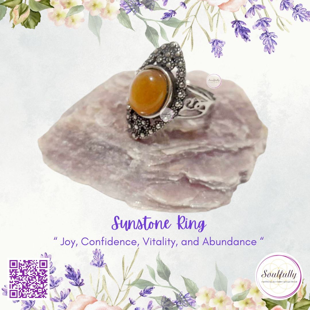 A Sunstone ring features a vibrant, shimmering crystal known for its warm, radiant energy. This gemstone is often associated with the sun’s life-giving power and is celebrated for boosting confidence, joy, and personal power.
